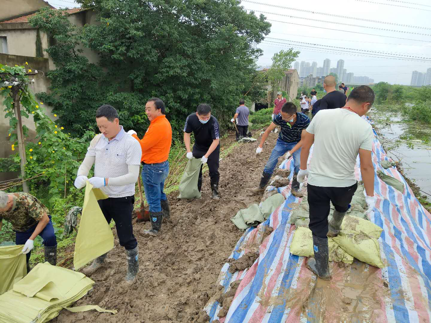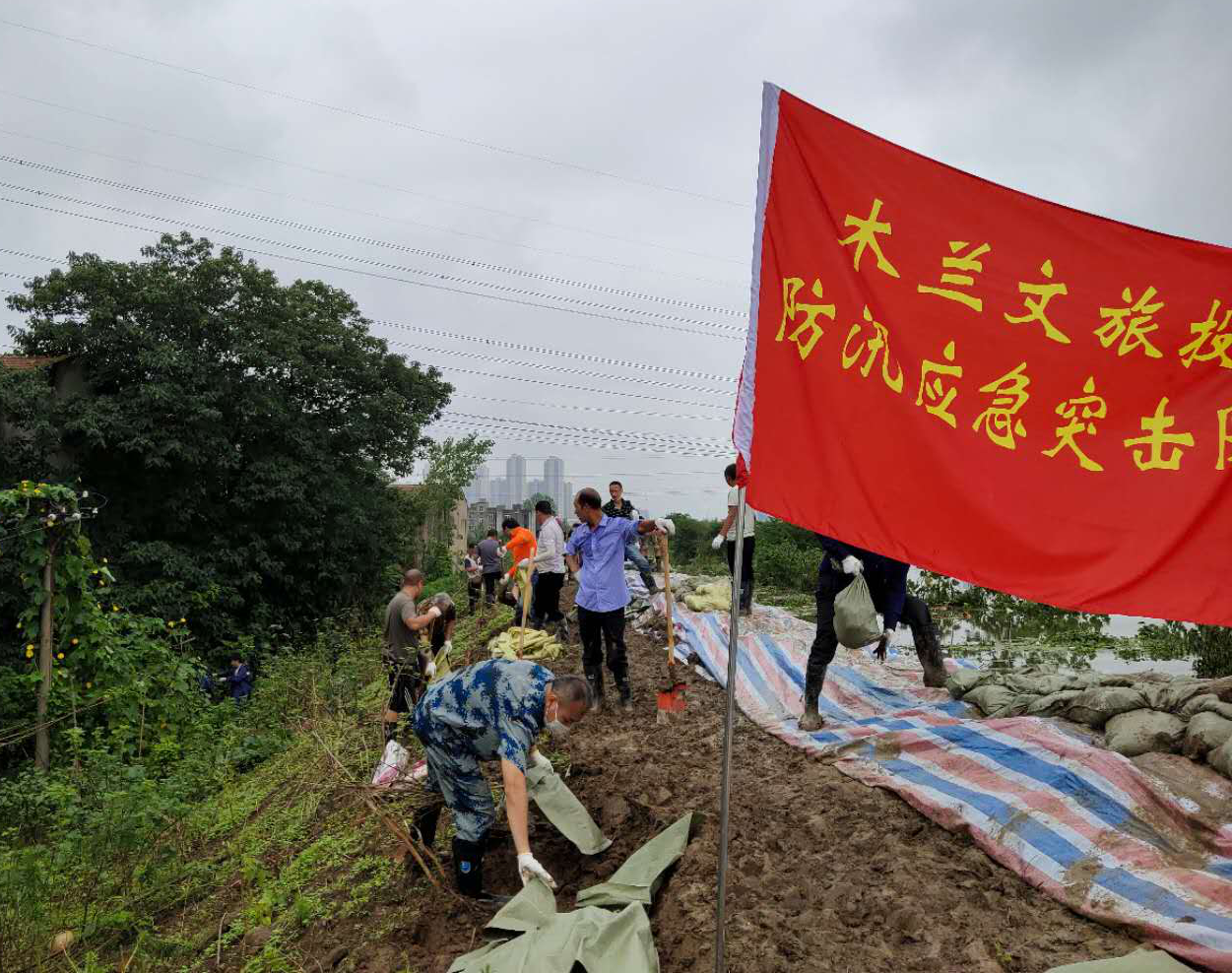 自6月中旬開始,公司班子成員帶隊進(jìn)行24小時防汛值班備勤,時刻關(guān)注,緊盯汛情。7月9日、10日在連續(xù)強(qiáng)降雨使得區(qū)內(nèi)防汛搶險工作日益嚴(yán)峻,木蘭文旅投臨危受命,緊急投入到全區(qū)防汛搶險工作中去。時間就是生命!根據(jù)區(qū)防指安排部署,木蘭文旅投防汛搶險突擊隊第一時間完成集結(jié),公司黨員同志主動請纓,奔赴險情嚴(yán)重的灄口街南湖村進(jìn)行堤岸加固搶險工作。